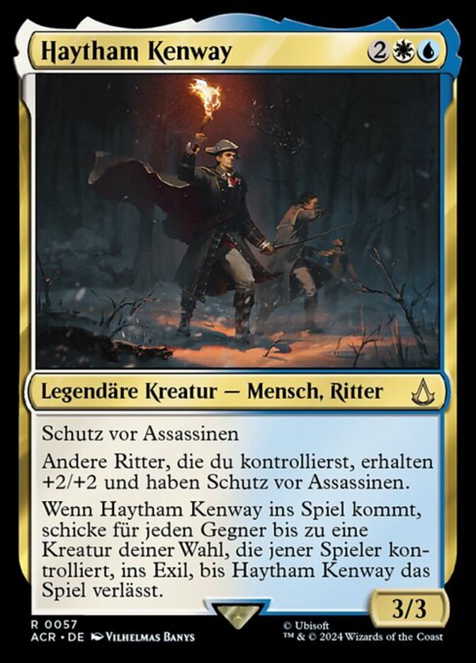 | Rules | Protection from Assassins Other Knights you control get +2/+2 and have protection from Assassins. When Haytham Kenway enters the battlefield, for each opponent, exile up to one target creature that player controls until Haytham Kenway leaves the battlefield. |