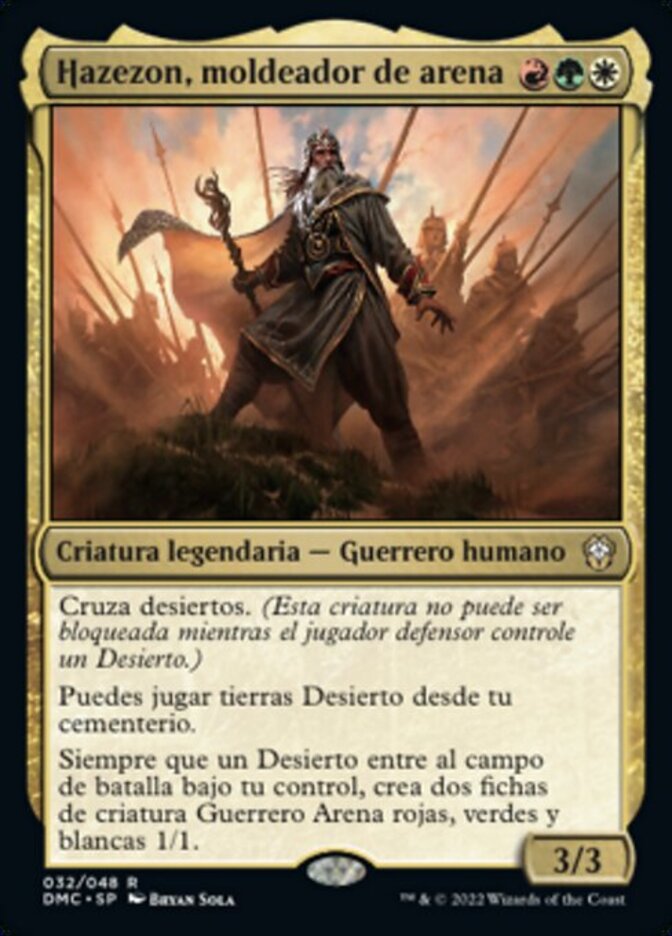 | Rules | Desertwalk (This creature can't be blocked as long as defending player controls a Desert.) You may play Desert lands from your graveyard. Whenever a Desert enters the battlefield under your control, create two 1/1 red, green, and white Sand Warrior creature tokens. |