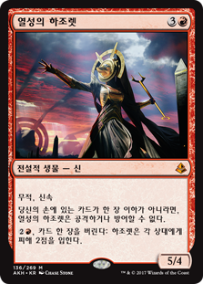 | Rules | Indestructible, haste Hazoret the Fervent can't attack or block unless you have one or fewer cards in hand. , Discard a card: Hazoret deals 2 damage to each opponent. |