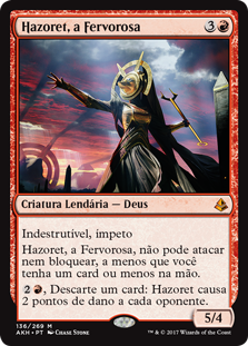 | Rules | Indestructible, haste Hazoret the Fervent can't attack or block unless you have one or fewer cards in hand. , Discard a card: Hazoret deals 2 damage to each opponent. |
