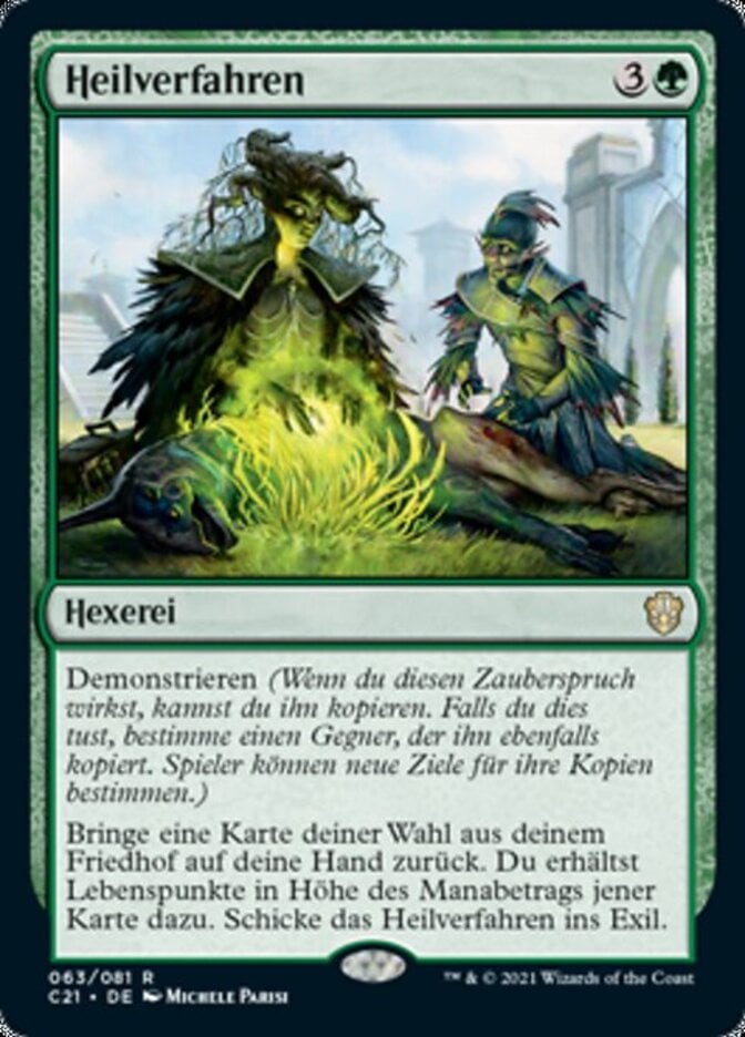 | Rules | Demonstrate (When you cast this spell, you may copy it. If you do, choose an opponent to also copy it. Players may choose new targets for their copies.) Return target card from your graveyard to your hand. You gain life equal to that card's mana value. Exile Healing Technique. |