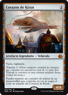 | Rules | Flying, vigilance Crew 3 (Tap any number of creatures you control with total power 3 or more: This Vehicle becomes an artifact creature until end of turn.) You may remove a loyalty counter from a planeswalker you control rather than pay Heart of Kiran's crew cost. |
