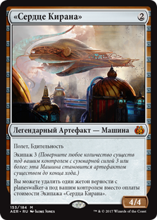 | Rules | Flying, vigilance Crew 3 (Tap any number of creatures you control with total power 3 or more: This Vehicle becomes an artifact creature until end of turn.) You may remove a loyalty counter from a planeswalker you control rather than pay Heart of Kiran's crew cost. |