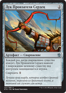 | Rules | Whenever equipped creature attacks, Heart-Piercer Bow deals 1 damage to target creature defending player controls. Equip (: Attach to target creature you control. Equip only as a sorcery.) |