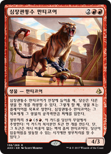 | Rules | When Heart-Piercer Manticore enters the battlefield, you may sacrifice another creature. When you do, Heart-Piercer Manticore deals damage equal to that creature's power to any target. Embalm (, Exile this card from your graveyard: Create a token that's a copy of it, except it's a white Zombie Manticore with no mana cost. Embalm only as a sorcery.) |