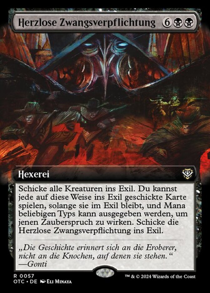 | Rules | Exile all creatures. For each card exiled this way, you may play that card for as long as it remains exiled, and mana of any type can be spent to cast that spell. Exile Heartless Conscription. |