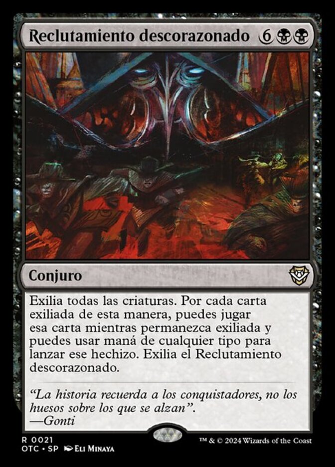 | Rules | Exile all creatures. For each card exiled this way, you may play that card for as long as it remains exiled, and mana of any type can be spent to cast that spell. Exile Heartless Conscription. |
