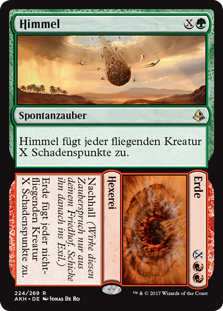 | Rules | Heaven deals X damage to each creature with flying. // Aftermath (Cast this spell only from your graveyard. Then exile it.) Earth deals X damage to each creature without flying. |