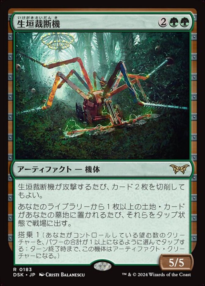| Rules | Whenever Hedge Shredder attacks, you may mill two cards. Whenever one or more land cards are put into your graveyard from your library, put them onto the battlefield tapped. Crew 1 (Tap any number of creatures you control with total power 1 or more: This Vehicle becomes an artifact creature until end of turn.) |