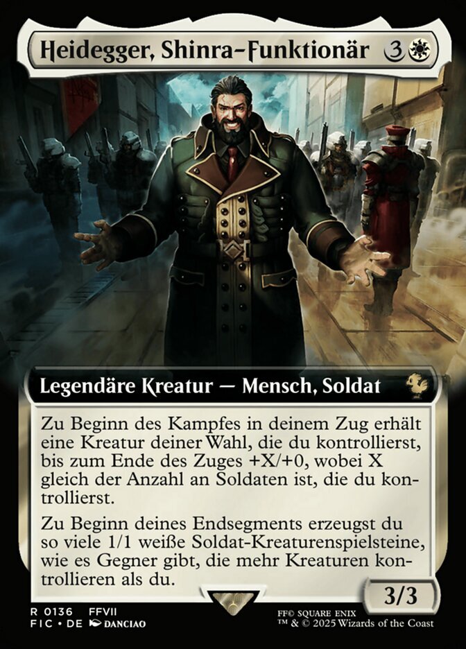 | Rules | At the beginning of combat on your turn, target creature you control gets +X/+0 until end of turn, where X is the number of Soldiers you control. At the beginning of your end step, create a number of 1/1 white Soldier creature tokens equal to the number of opponents who control more creatures than you. |