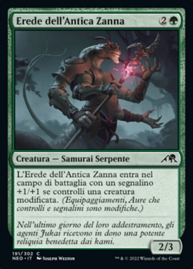 | Rules | Heir of the Ancient Fang enters the battlefield with a +1/+1 counter on it if you control a modified creature. (Equipment, Auras you control, and counters are modifications.) |