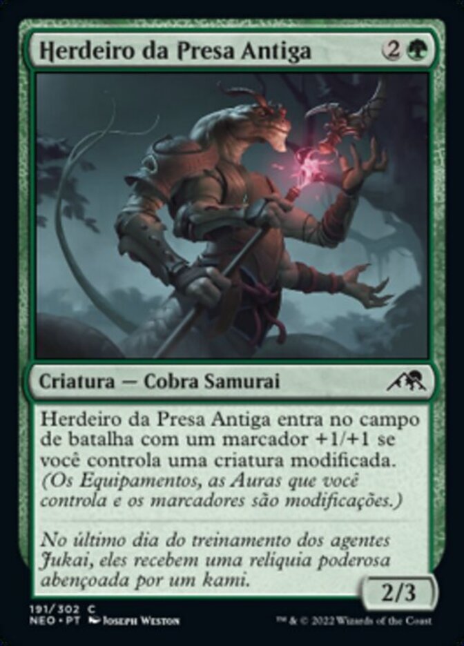 | Rules | Heir of the Ancient Fang enters the battlefield with a +1/+1 counter on it if you control a modified creature. (Equipment, Auras you control, and counters are modifications.) |