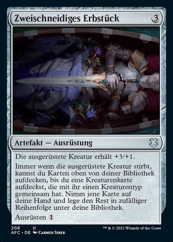 | Rules | Equipped creature gets +3/+1. Whenever equipped creature dies, you may reveal cards from the top of your library until you reveal a creature card that shares a creature type with it. Put that card into your hand and the rest on the bottom of your library in a random order. Equip |