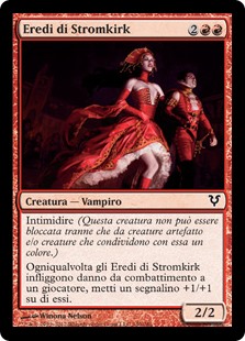 | Rules | Intimidate (This creature can't be blocked except by artifact creatures and/or creatures that share a color with it.) Whenever Heirs of Stromkirk deals combat damage to a player, put a +1/+1 counter on it. |