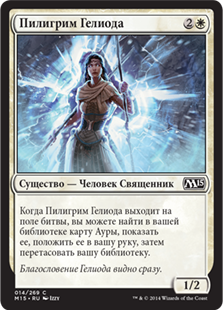 | Rules | When Heliod's Pilgrim enters the battlefield, you may search your library for an Aura card, reveal it, put it into your hand, then shuffle. |