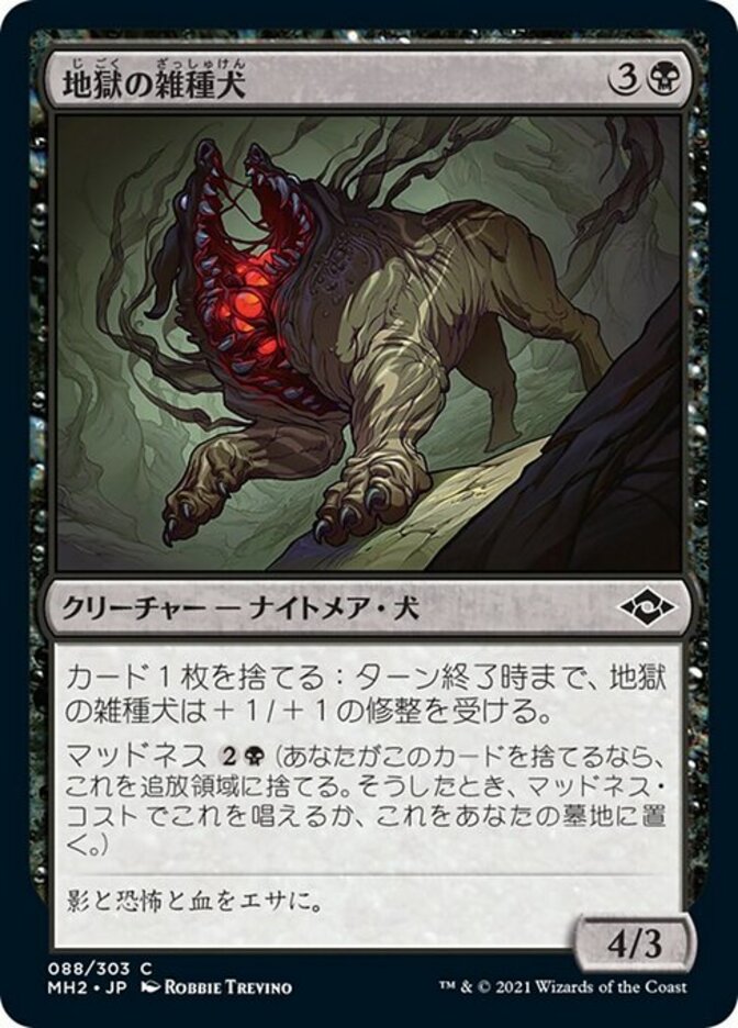 | Rules | Discard a card: Hell Mongrel gets +1/+1 until end of turn. Madness (If you discard this card, discard it into exile. When you do, cast it for its madness cost or put it into your graveyard.) |