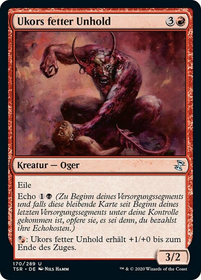 | Rules | Haste Echo (At the beginning of your upkeep, if this came under your control since the beginning of your last upkeep, sacrifice it unless you pay its echo cost.) : Henchfiend of Ukor gets +1/+0 until end of turn. |