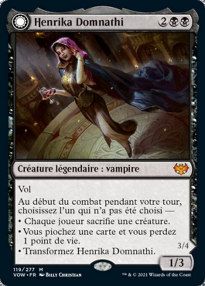 | Rules | Flying At the beginning of combat on your turn, choose one that hasn't been chosen — • Each player sacrifices a creature. • You draw a card and you lose 1 life. • Transform Henrika Domnathi. // Flying, deathtouch, lifelink : Each creature you control with flying, deathtouch, and/or lifelink gets +1/+0 until end of turn. |