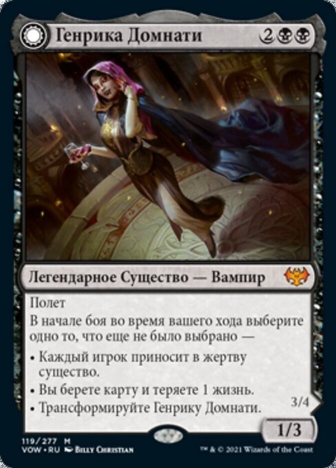 | Rules | Flying At the beginning of combat on your turn, choose one that hasn't been chosen — • Each player sacrifices a creature. • You draw a card and you lose 1 life. • Transform Henrika Domnathi. // Flying, deathtouch, lifelink : Each creature you control with flying, deathtouch, and/or lifelink gets +1/+0 until end of turn. |