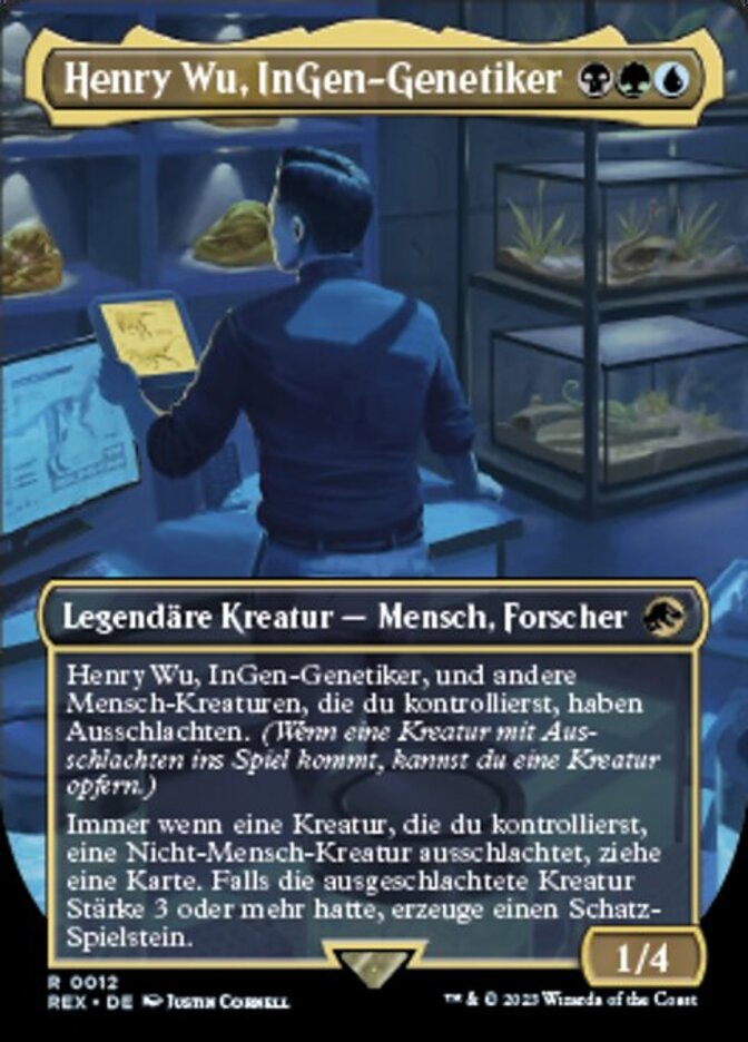 | Rules | Henry Wu, InGen Geneticist and other Human creatures you control have exploit. (When a creature with exploit enters the battlefield, you may sacrifice a creature.) Whenever a creature you control exploits a non-Human creature, draw a card. If the exploited creature had power 3 or greater, create a Treasure token. |