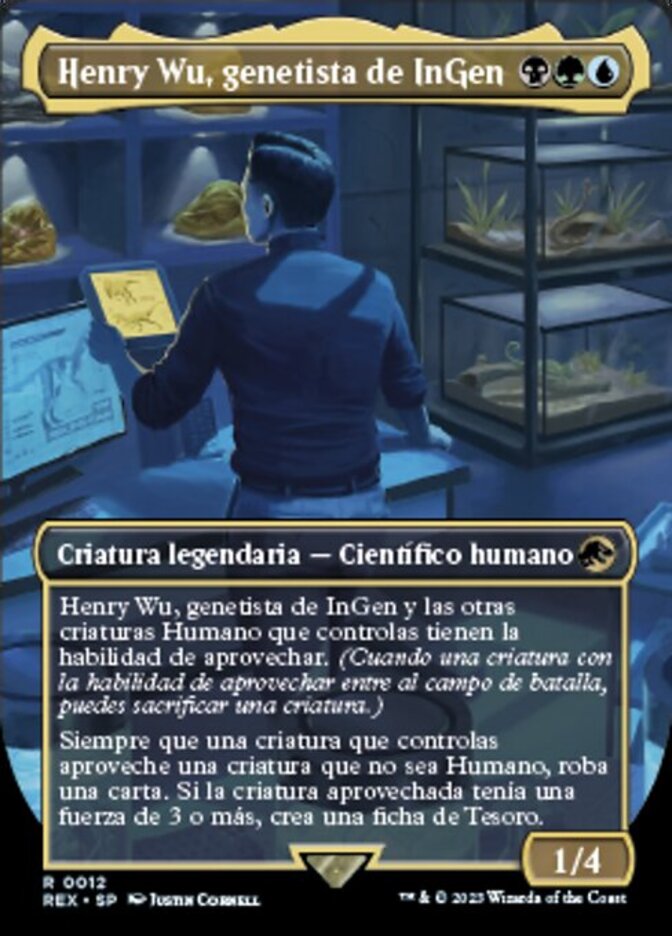 | Rules | Henry Wu, InGen Geneticist and other Human creatures you control have exploit. (When a creature with exploit enters the battlefield, you may sacrifice a creature.) Whenever a creature you control exploits a non-Human creature, draw a card. If the exploited creature had power 3 or greater, create a Treasure token. |