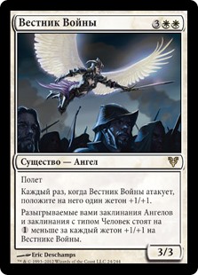 | Rules | Flying Whenever Herald of War attacks, put a +1/+1 counter on it. Angel spells and Human spells you cast cost less to cast for each +1/+1 counter on Herald of War. |
