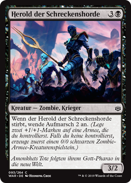 | Rules | When Herald of the Dreadhorde dies, amass 2. (Put two +1/+1 counters on an Army you control. If you don't control one, create a 0/0 black Zombie Army creature token first.) |