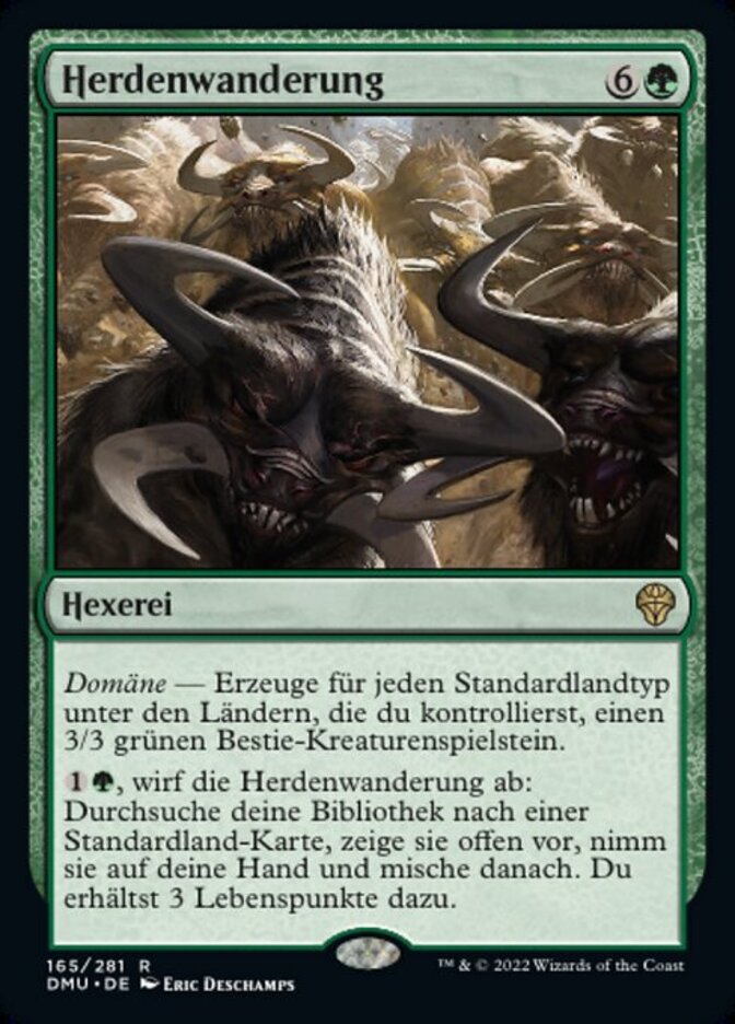 | Rules | Domain — Create a 3/3 green Beast creature token for each basic land type among lands you control. , Discard Herd Migration: Search your library for a basic land card, reveal it, put it into your hand, then shuffle. You gain 3 life. |