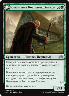 | Rules | Whenever an opponent casts a spell during your turn, draw a card. At the beginning of each upkeep, if no spells were cast last turn, transform Hermit of the Natterknolls. // Whenever an opponent casts a spell during your turn, draw two cards. At the beginning of each upkeep, if a player cast two or more spells last turn, transform Lone Wolf of the Natterknolls. |