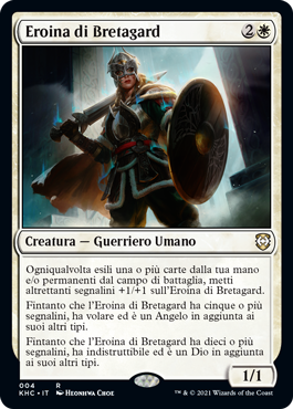 | Rules | Whenever one or more cards are put into exile from your hand or a spell or ability you control exiles one or more permanents from the battlefield, put that many +1/+1 counters on Hero of Bretagard. As long as Hero of Bretagard has five or more counters on it, it has flying and is an Angel in addition to its other types. As long as Hero of Bretagard has ten or more counters on it, it has indestructible and is a God in addition to its other types. |