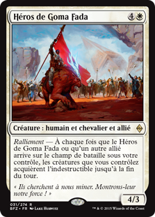 | Rules | Rally — Whenever Hero of Goma Fada or another Ally enters the battlefield under your control, creatures you control gain indestructible until end of turn. |