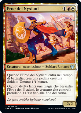 | Rules | When Hero of the Nyxborn enters the battlefield, create a 1/1 white Human Soldier creature token. Whenever you cast a spell that targets Hero of the Nyxborn, creatures you control get +1/+0 until end of turn. |