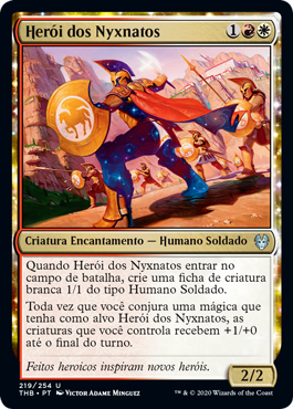 | Rules | When Hero of the Nyxborn enters the battlefield, create a 1/1 white Human Soldier creature token. Whenever you cast a spell that targets Hero of the Nyxborn, creatures you control get +1/+0 until end of turn. |