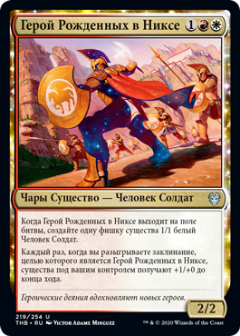 | Rules | When Hero of the Nyxborn enters the battlefield, create a 1/1 white Human Soldier creature token. Whenever you cast a spell that targets Hero of the Nyxborn, creatures you control get +1/+0 until end of turn. |