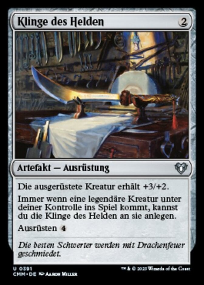 | Rules | Equipped creature gets +3/+2. Whenever a legendary creature enters the battlefield under your control, you may attach Hero's Blade to it. Equip (: Attach to target creature you control. Equip only as a sorcery.) |