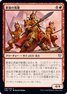 | Rules | When Heroes of the Revel enters the battlefield, create a 1/1 red Satyr creature token with "This creature can't block." Whenever you cast a spell that targets Heroes of the Revel, creatures you control get +1/+0 until end of turn. |