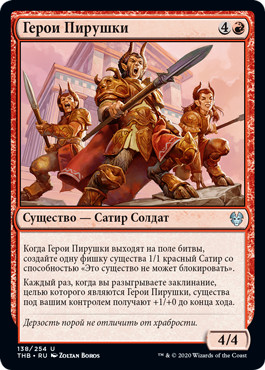 | Rules | When Heroes of the Revel enters the battlefield, create a 1/1 red Satyr creature token with "This creature can't block." Whenever you cast a spell that targets Heroes of the Revel, creatures you control get +1/+0 until end of turn. |