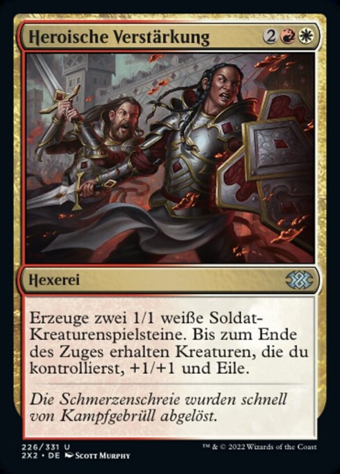 | Rules | Create two 1/1 white Soldier creature tokens. Until end of turn, creatures you control get +1/+1 and gain haste. (They can attack and this turn.) |