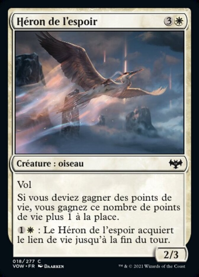 | Rules | Flying If you would gain life, you gain that much life plus 1 instead. : Heron of Hope gains lifelink until end of turn. |