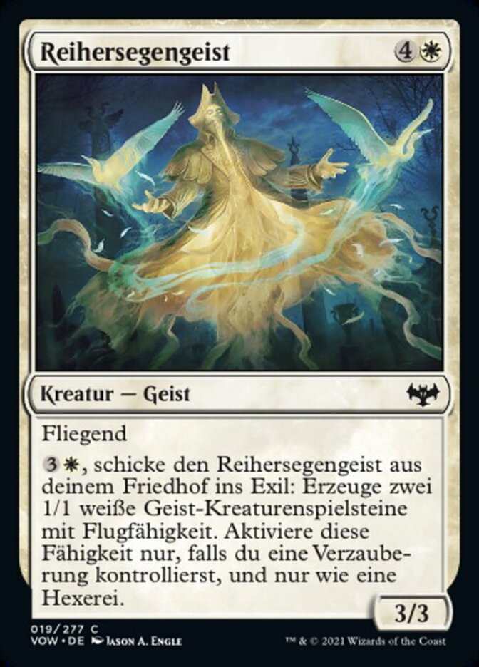 | Rules | Flying , Exile Heron-Blessed Geist from your graveyard: Create two 1/1 white Spirit creature tokens with flying. Activate only if you control an enchantment and only as a sorcery. |