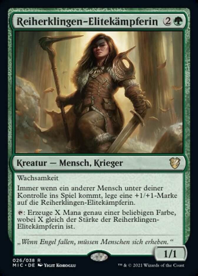 | Rules | Vigilance Whenever another Human enters the battlefield under your control, put a +1/+1 counter on Heronblade Elite. : Add X mana of any one color, where X is Heronblade Elite's power. |