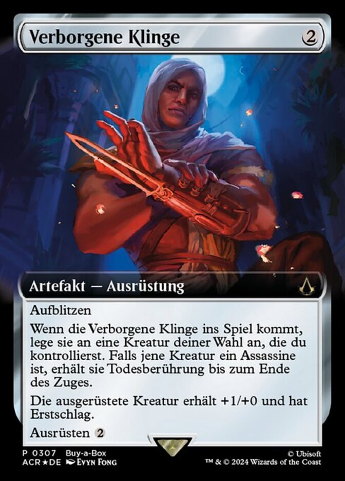 | Rules | Flash When Hidden Blade enters the battlefield, attach it to target creature you control. If that creature is an Assassin, it gains deathtouch until end of turn. Equipped creature gets +1/+0 and has first strike. Equip |
