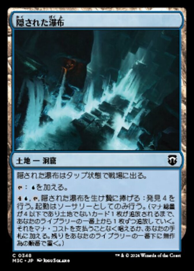 | Rules | Hidden Cataract enters the battlefield tapped. : Add . , , Sacrifice Hidden Cataract: Discover 4. Activate only as a sorcery. (Exile cards from the top of your library until you exile a nonland card with mana value 4 or less. Cast it without paying its mana cost or put it into your hand. Put the rest on the bottom in a random order.) |