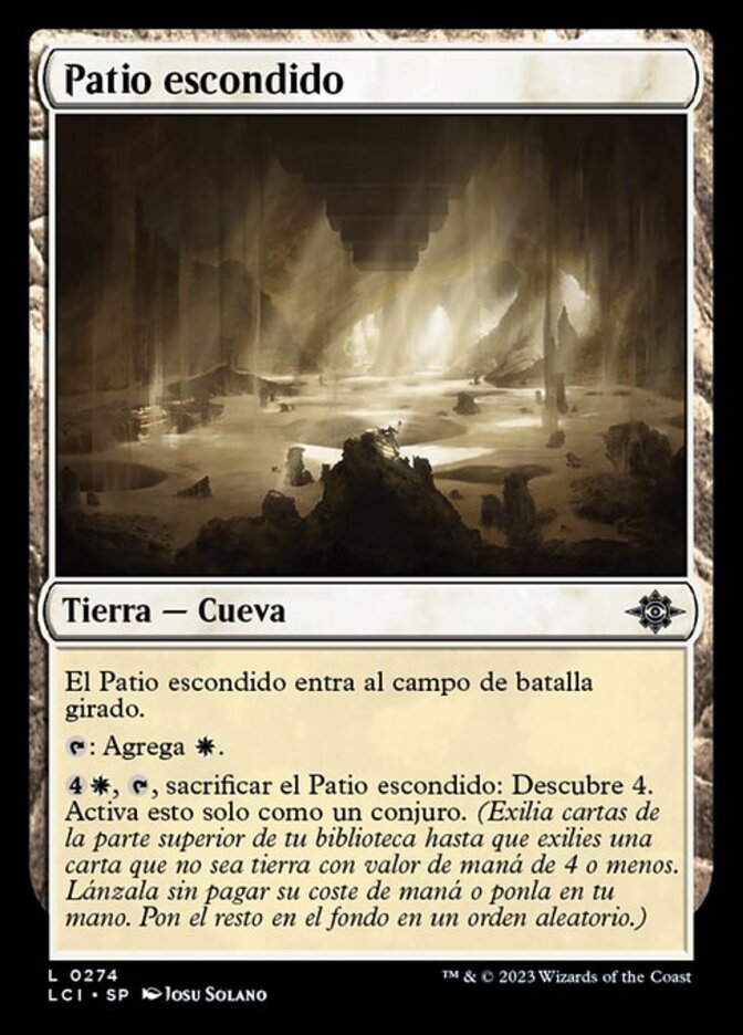 | Rules | Hidden Courtyard enters the battlefield tapped. : Add . , , Sacrifice Hidden Courtyard: Discover 4. Activate only as a sorcery. (Exile cards from the top of your library until you exile a nonland card with mana value 4 or less. Cast it without paying its mana cost or put it into your hand. Put the rest on the bottom in a random order.) |