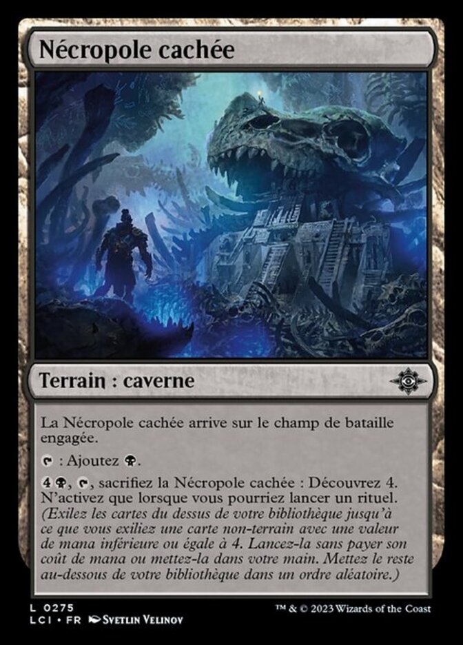 | Rules | Hidden Necropolis enters the battlefield tapped. : Add . , , Sacrifice Hidden Necropolis: Discover 4. Activate only as a sorcery. (Exile cards from the top of your library until you exile a nonland card with mana value 4 or less. Cast it without paying its mana cost or put it into your hand. Put the rest on the bottom in a random order.) |