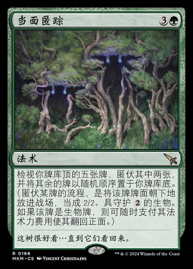 | Rules | Look at the top five cards of your library, cloak two of them, and put the rest on the bottom of your library in a random order. (To cloak a card, put it onto the battlefield face down as a 2/2 creature with ward . Turn it face up any time for its mana cost if it's a creature card.) |