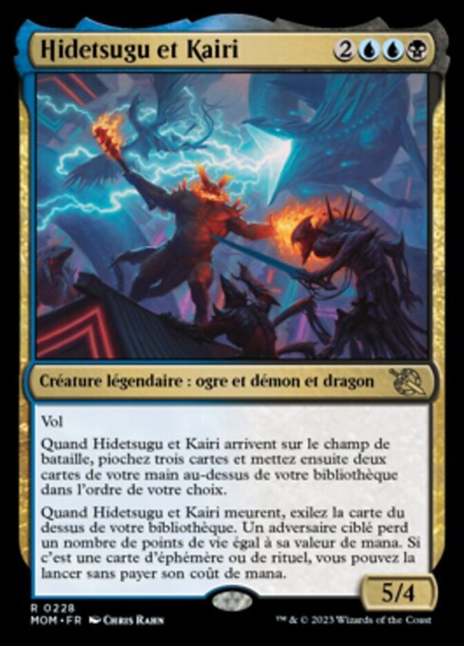 | Rules | Flying When Hidetsugu and Kairi enters the battlefield, draw three cards, then put two cards from your hand on top of your library in any order. When Hidetsugu and Kairi dies, exile the top card of your library. Target opponent loses life equal to its mana value. If it's an instant or sorcery card, you may cast it without paying its mana cost. |