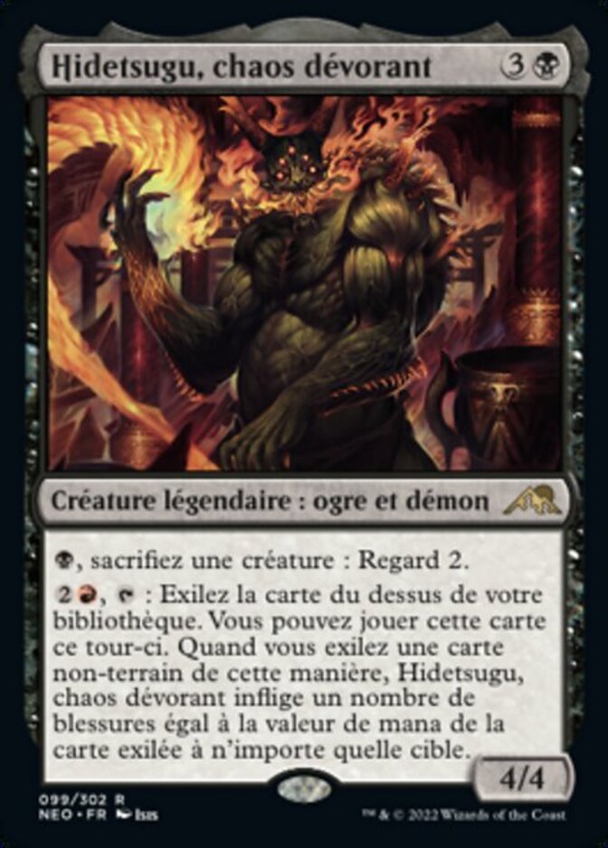 | Rules | , Sacrifice a creature: Scry 2. , : Exile the top card of your library. You may play that card this turn. When you exile a nonland card this way, Hidetsugu, Devouring Chaos deals damage equal to the exiled card's mana value to any target. |