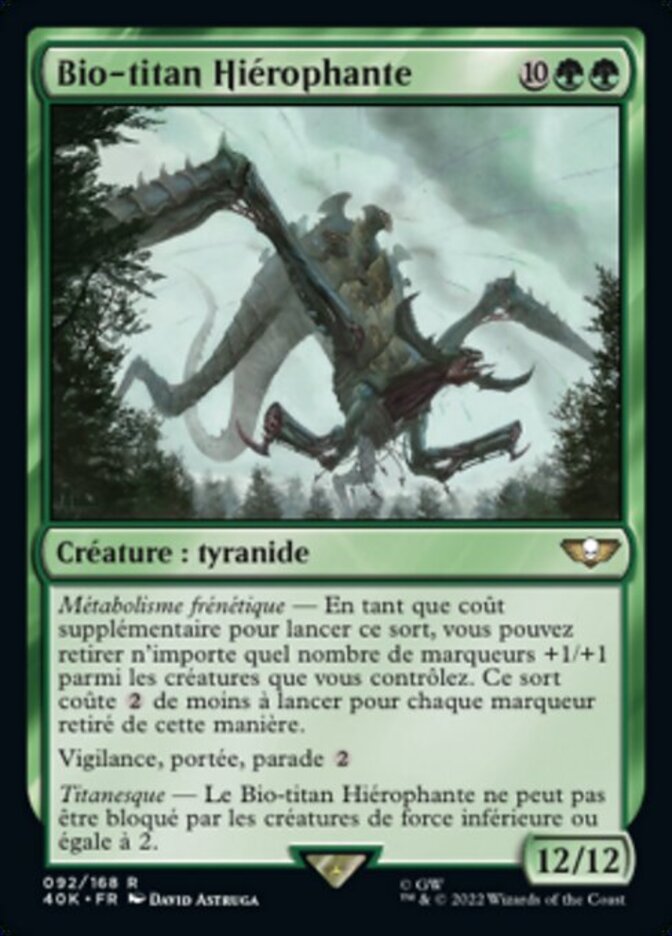 | Rules | Frenzied Metabolism — As an additional cost to cast this spell, you may remove any number of +1/+1 counters from among creatures you control. This spell costs less to cast for each counter removed this way. Vigilance, reach, ward Titanic — Hierophant Bio-Titan can't be blocked by creatures with power 2 or less. |