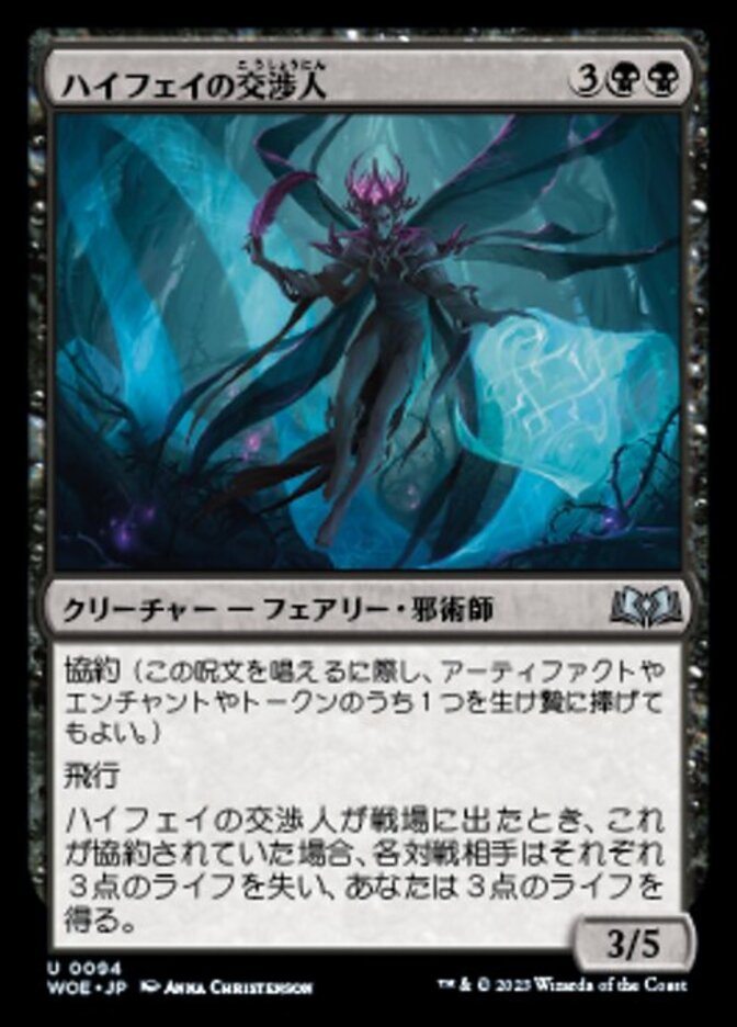 | Rules | Bargain (You may sacrifice an artifact, enchantment, or token as you cast this spell.) Flying When High Fae Negotiator enters the battlefield, if it was bargained, each opponent loses 3 life and you gain 3 life. |
